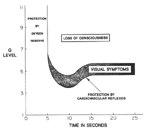 Without these compensatory mechanisms the tolerance to +G loadings results primarily from the height of the previously mentioned hydrostatic column between the heart and the head.  The greater the height of this column the lower the G tolerance because the greater the height of the column blood, the higher the cardiac output must be to maintain sufficient blood flow to the head, especially during elevated +Gz exposure.  Thus, reclined seat positions which act to decrease the vertical component of the distance between the heart and head, are one method of increasing Gz tolerances. (NAMI, 2000)