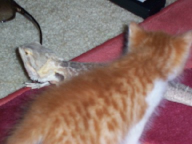 Monster the alley cat and Petro the bearded dragon. TX-KingsnakeWhite >+
