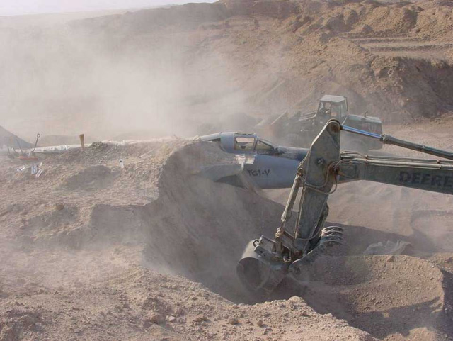 Reports were about two dozen aircraft were found buried. Although this one is an older Foxbat Mig 25, at least one Mig 29 was recovered and some were said to have some advanced electronics that would place them post Gulf War ? Buried up to 10 feet in the sand, sealed, some had their wings removed.