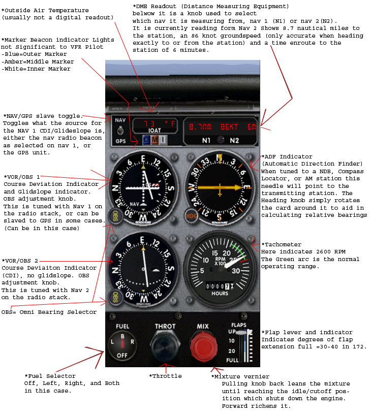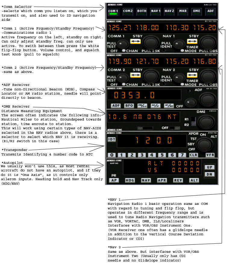 Learn the names and positions of each component as well as how  to set/adjust them, initially with  emphasis on the NAV and Com radios in particular, as these will be used on your first flights with TX Flight Sim Ground School. If you know what the standby frequency of Nav 2 is, for example, it will make life a bit easier for all.